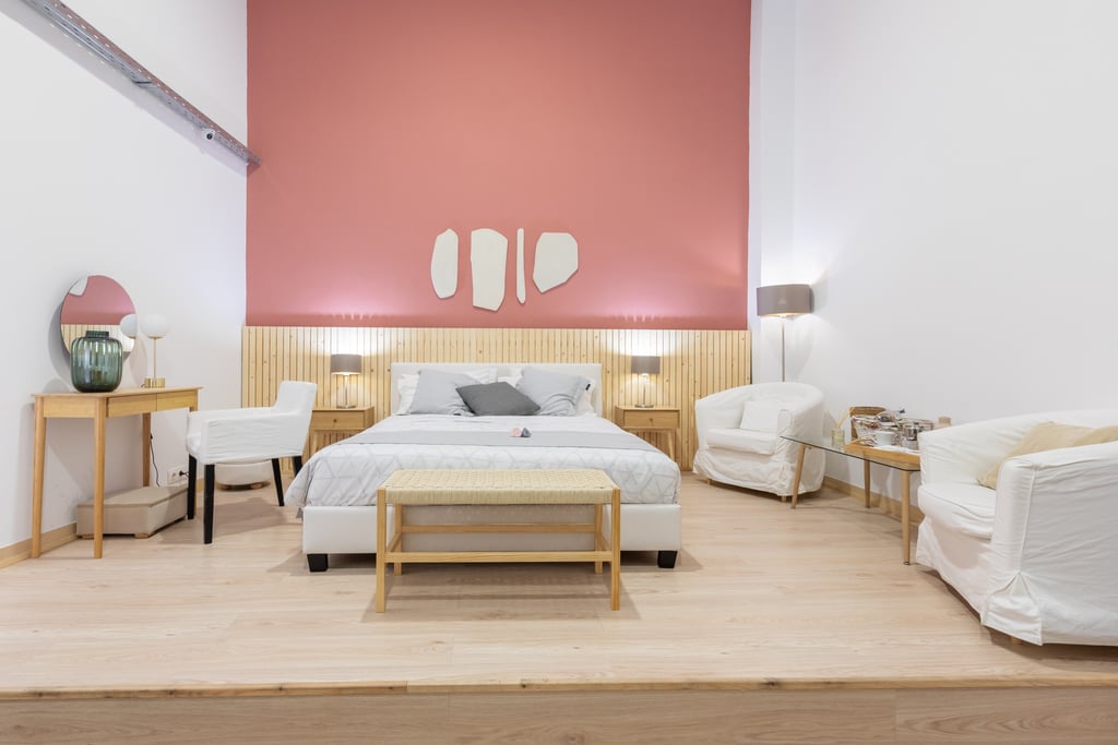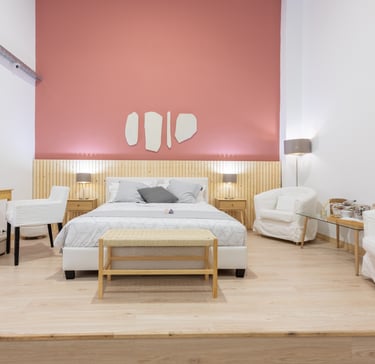 Fully immersive training areas replicating hotel workspaces, including a staged hotel room with bedroom, bathroom, and lounge areas. Participants train in hospitality operations, housekeeping, front-of-house service, and more.