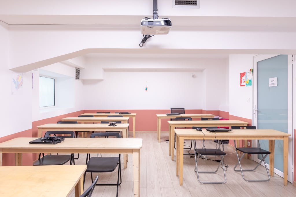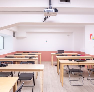 Bright, modern classrooms designed for collaborative learning. These are used for theory sessions, career coaching, soft skills development, and digital literacy training.