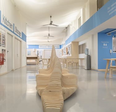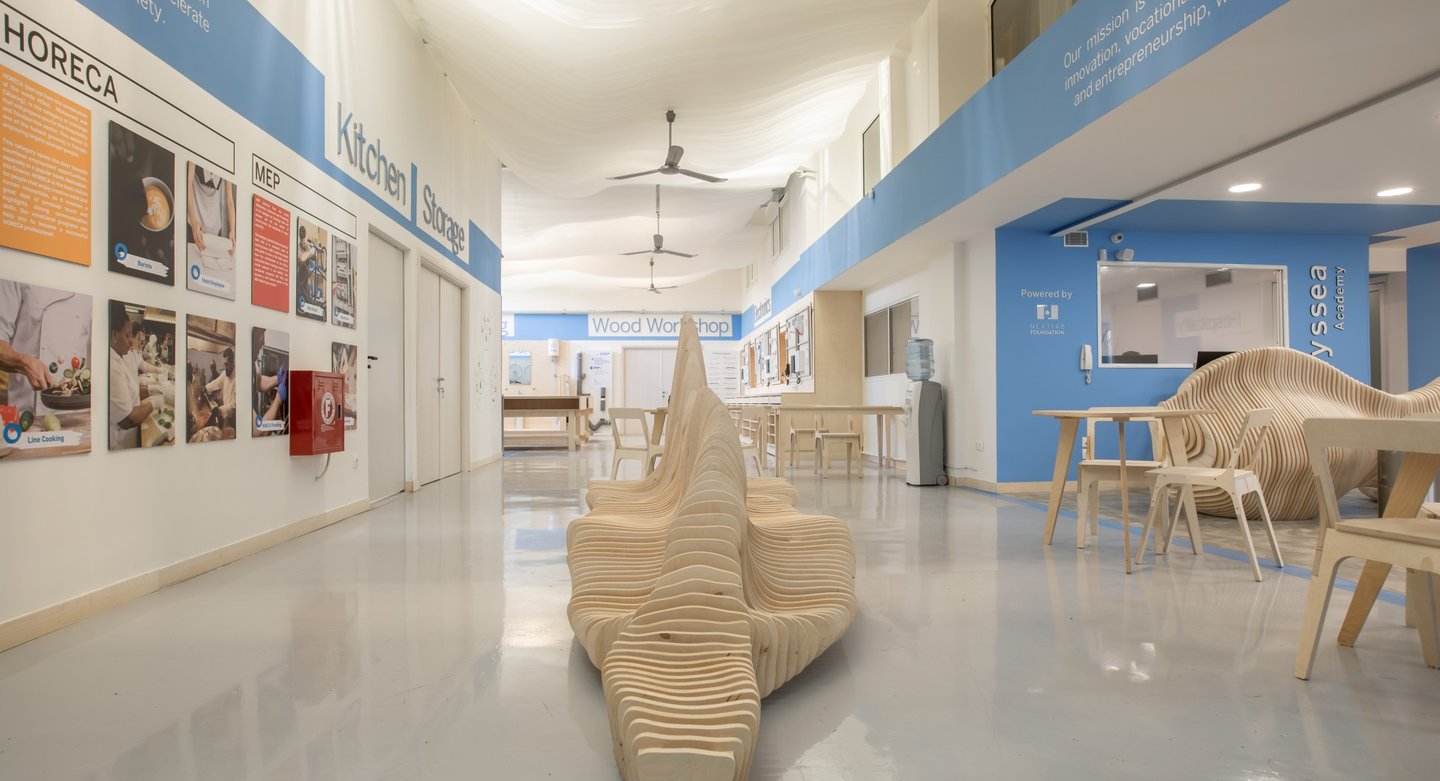 A multi-use open area designed for talks, lectures, and exhibitions. All furniture and fixtures were built in-house by Odyssea’s own workshop team — demonstrating our commitment to circular design and self-reliance.